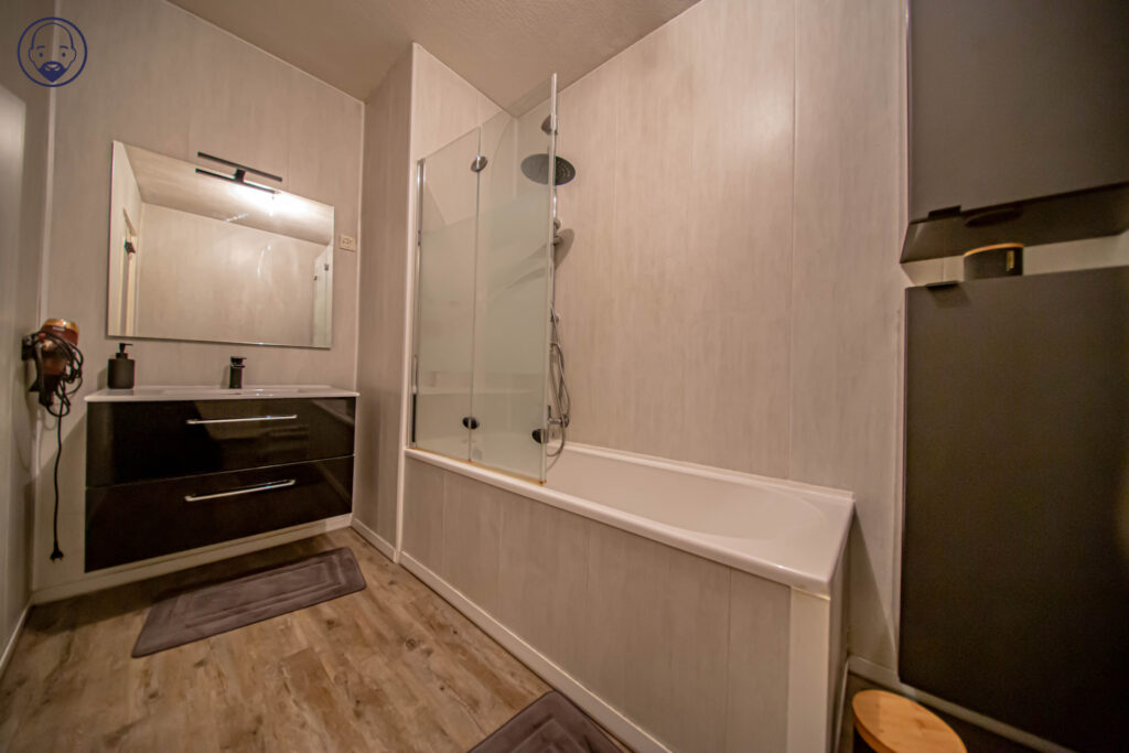 Elle se compose au rez-de-chaussée, d’une entrée, d’un espace de rangement, d’un séjour / salle à manger lumineux, ainsi que d’une cuisine séparée entièrement équipée.