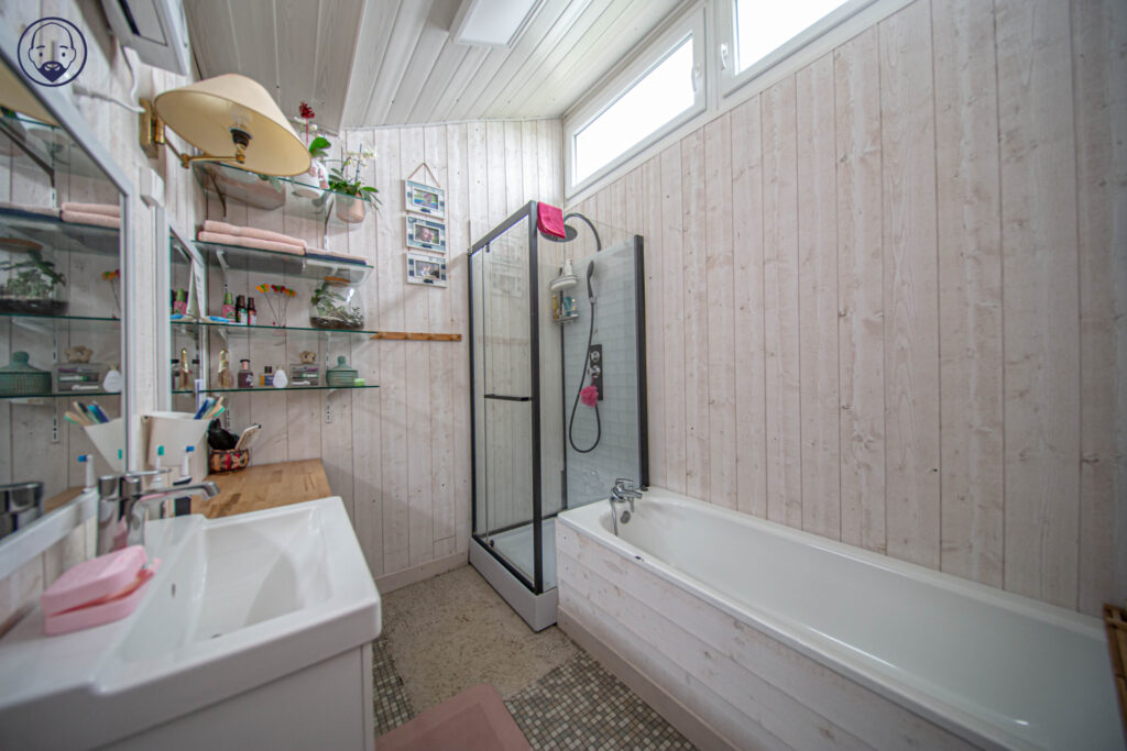 En rez de jardin : une entrée , petit coin cuisine , salle d’eau , wc séparé et une trés grande chambre ! A noter cette partie se prête à de la location saisonnière ou autre , en indépendance , type Airbnb ..
