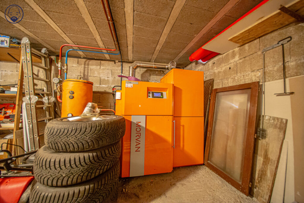 Le chauffage central est assuré par une chaudière à granulés de ‘ Marque Morvan ‘ , on retrouve également un poêle à bois dans la pièce de vie en rdc .