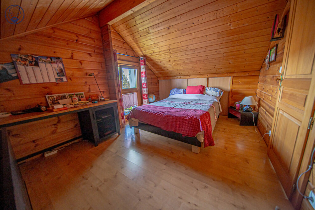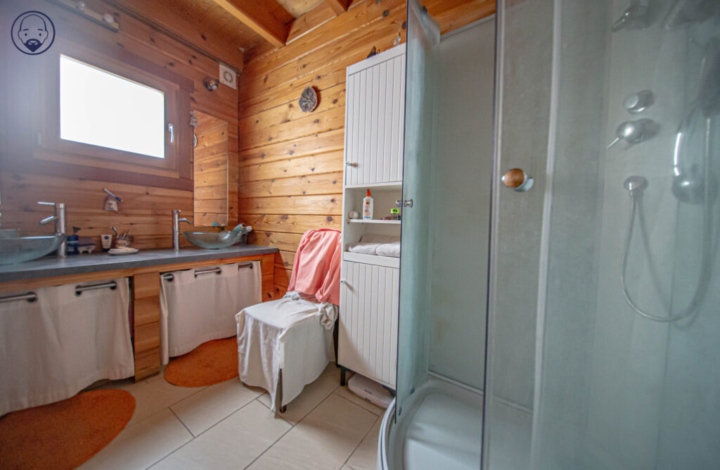 En rez de chaussée : cuisine équipée ouverte sur salle à manger salon (poele à bois), salle d’eau, wc, buanderie dressing, bureau (dressing), une chambre.