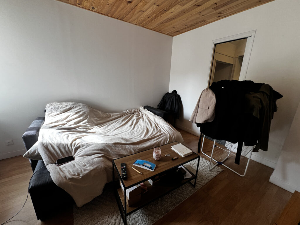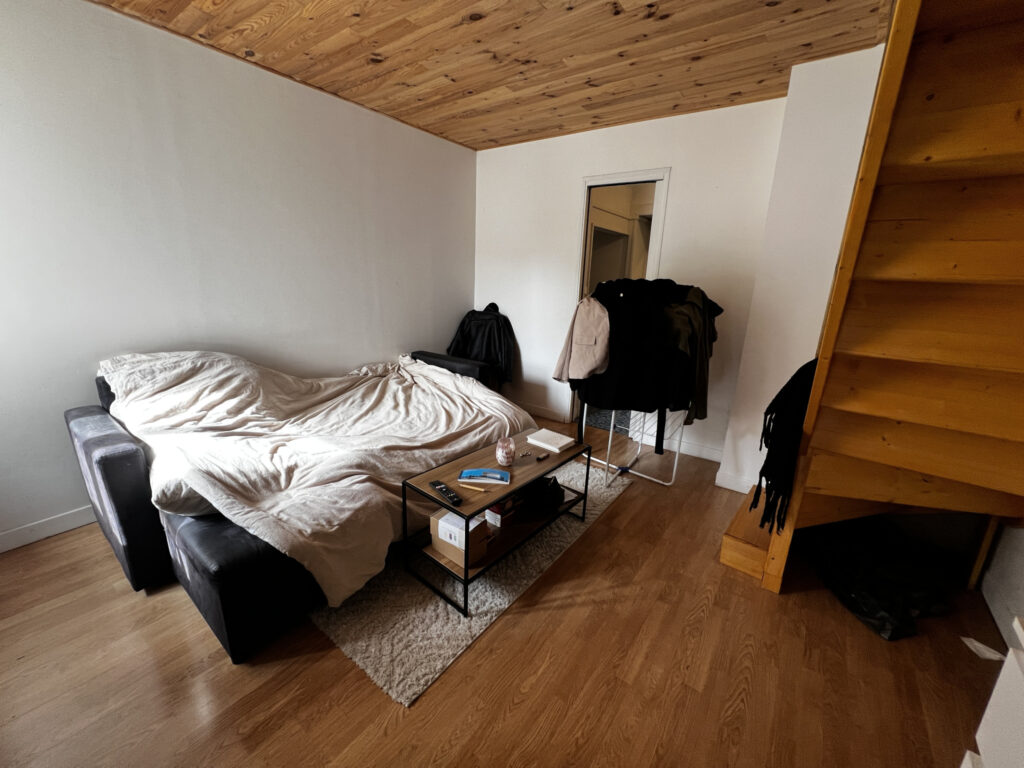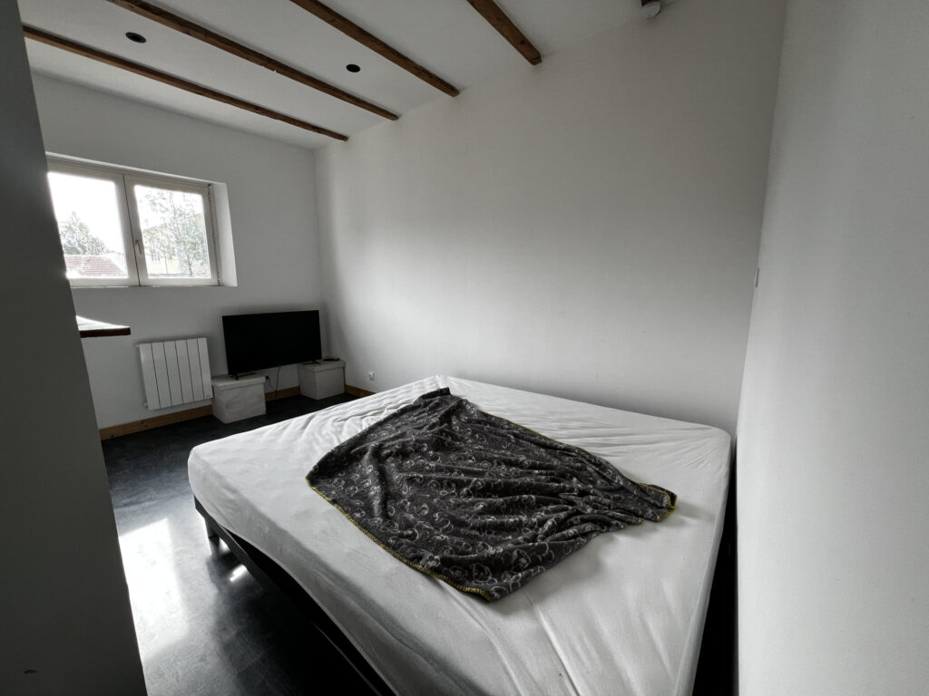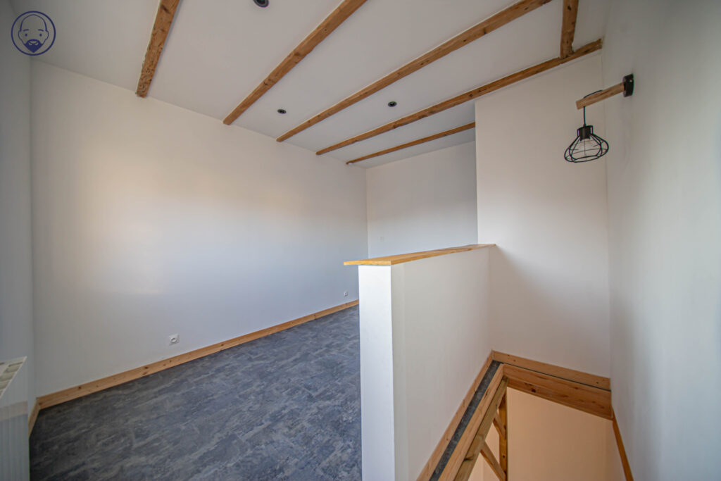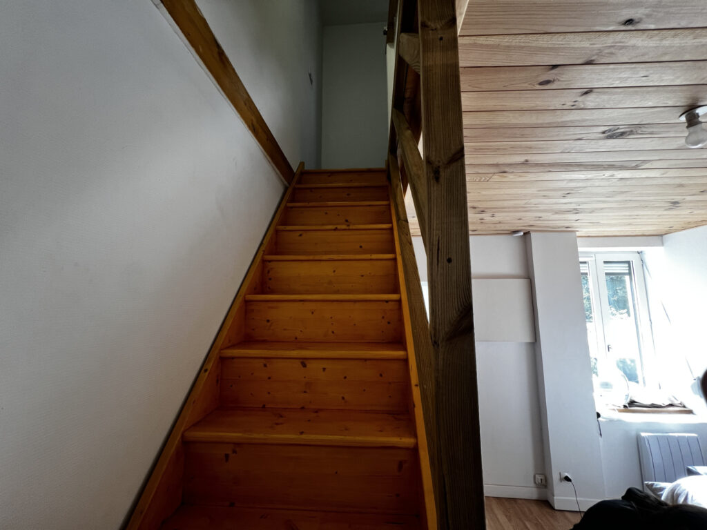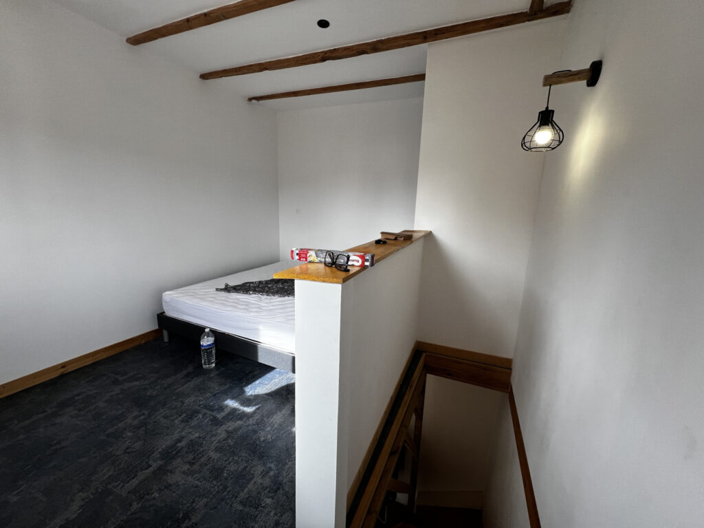 À l’étage, un escalier mène à une spacieuse chambre, à la fois confortable et cocooning.