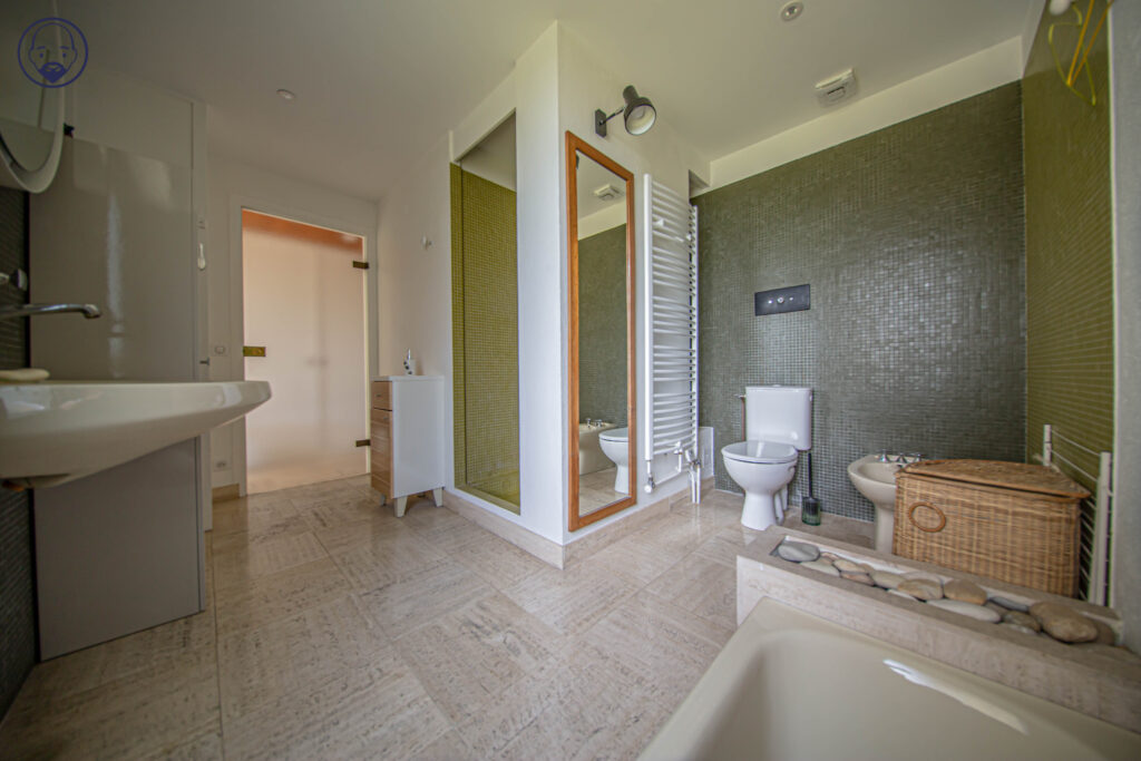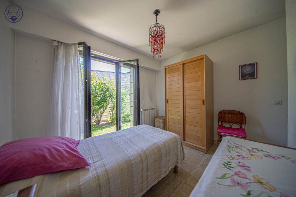 L’espace nuit se compose quant à lui d’une chambre parentale avec placards et ouvertures sur la terrase et le jardin, une salle de bains avec douche et baignoire, une seconde chambre avec sa salle de douche et 1 wc indépendant. Une 3ème chambre peut être aménagée également car une petite alcôve se situe dans le salon.