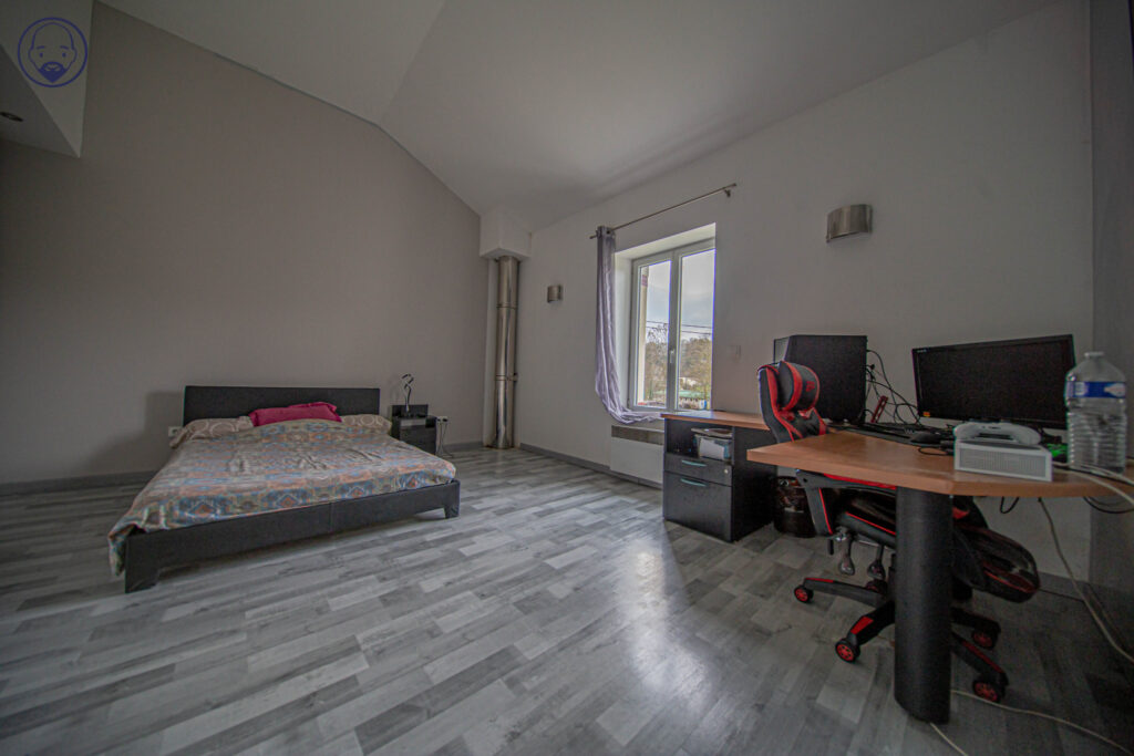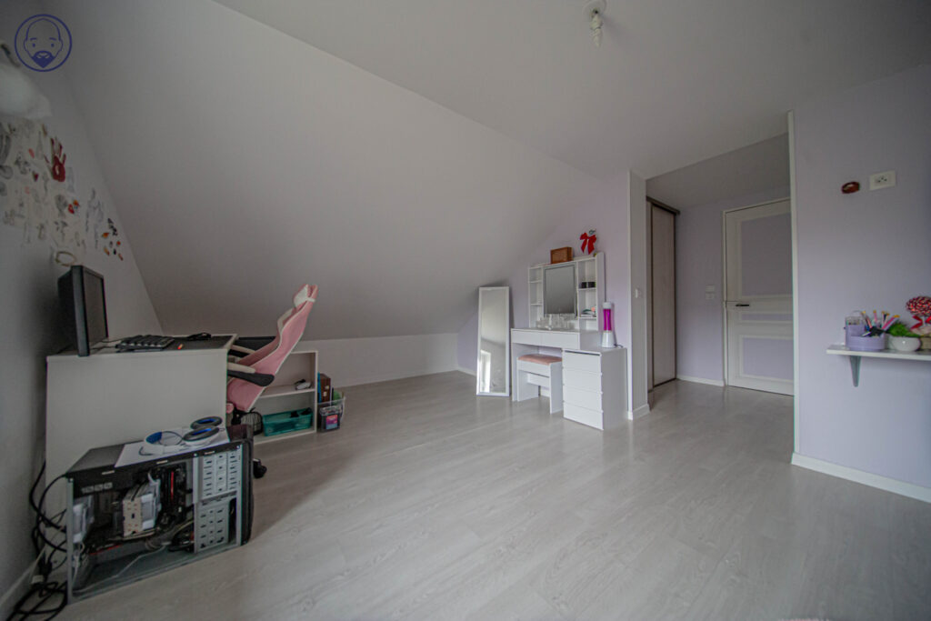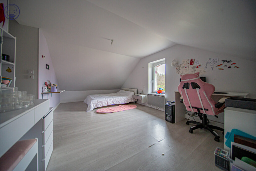 À l’étage, un vaste palier pouvant faire office de salle de jeux mène à une première chambre avec dressing, une seconde chambre avec espace de rangement, ainsi que deux grandes chambres supplémentaires disposant de placards.
