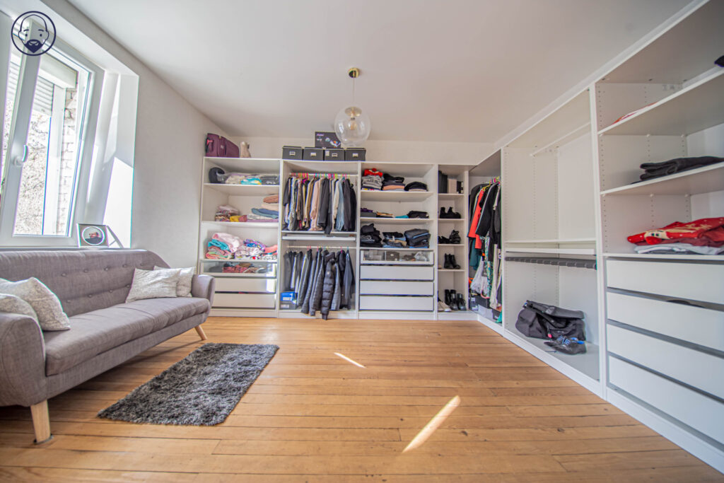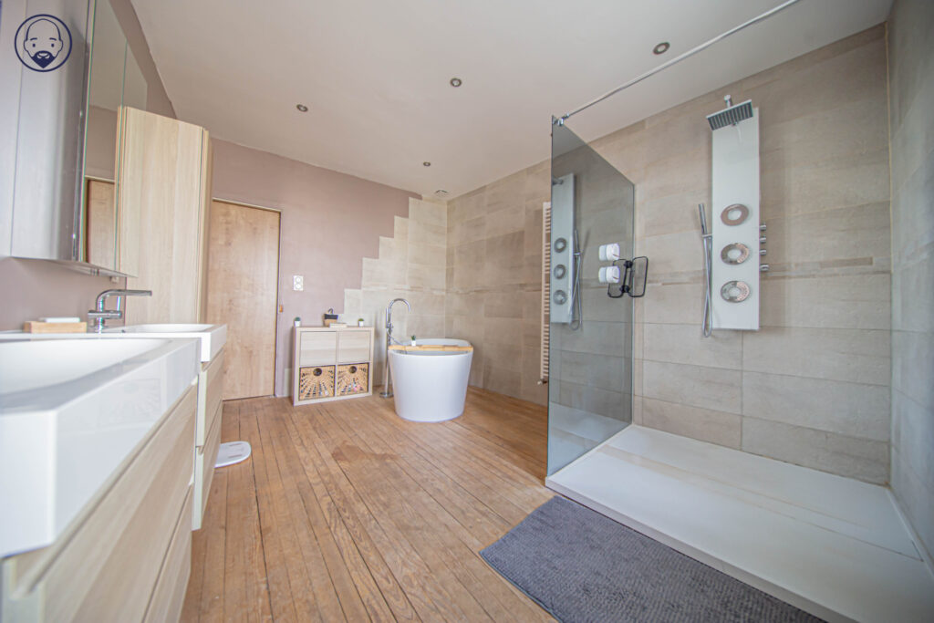 A l’étage : 1 chambre parentale avec grand dressing, 2 chambres, salle de bains avec douche et baignoire et wc.