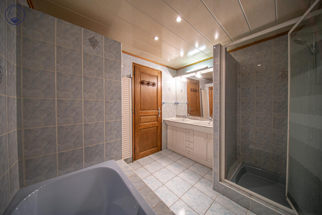 À l’étage… Grande pièce de vie avec cuisine américaine, 2 chambres, salle de bains avec douche et baignoire, WC.