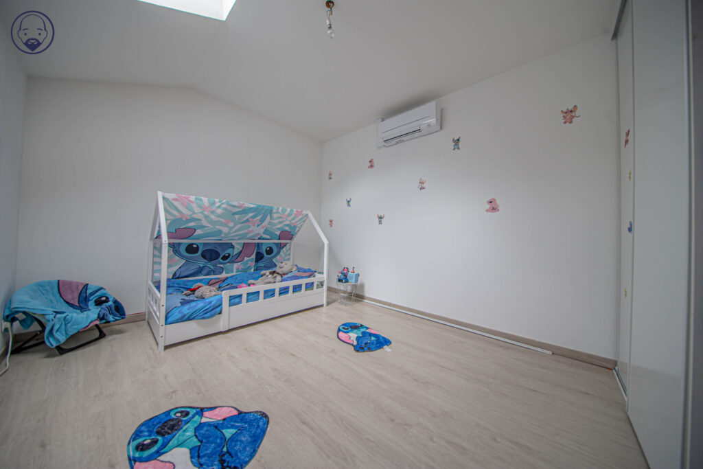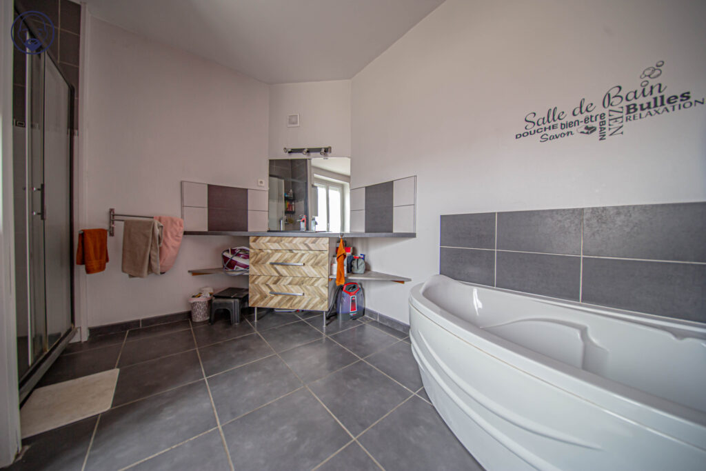 Au rez-de-chaussée, une pièce avec chaufferie, une chambre, une salle d’eau avec WC, une buanderie et une cave.