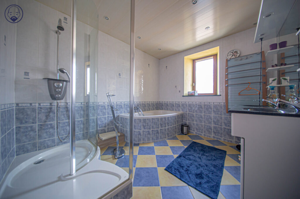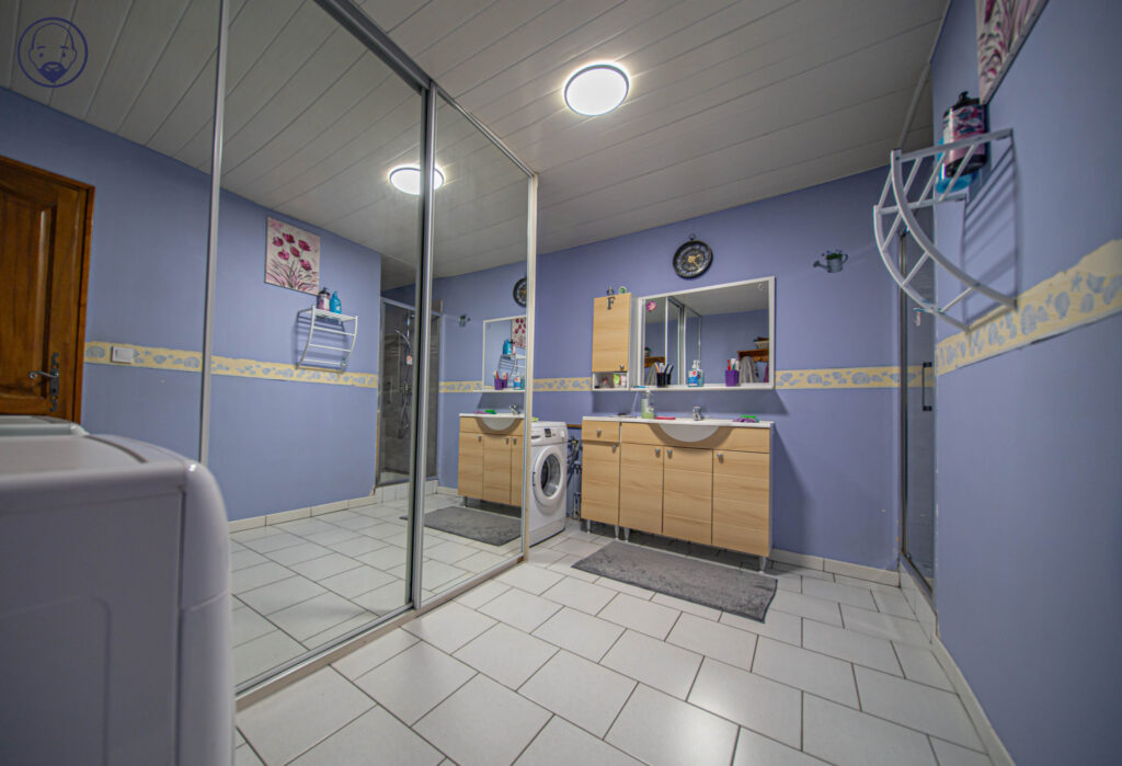 – À l’étage, une mezzanine dessert un WC, trois chambres, dont l’une est équipée de placards, ainsi qu’une seconde salle de bain avec une douche et un meuble double vasque. Un petit grenier, idéal pour le stockage, vient parfaire cet espace.