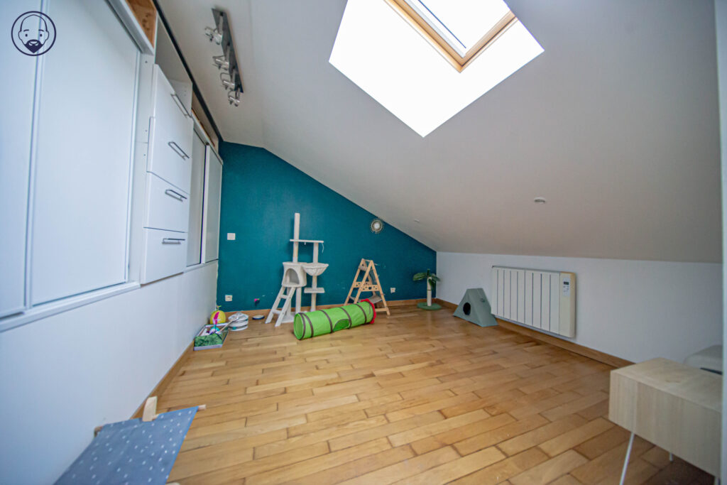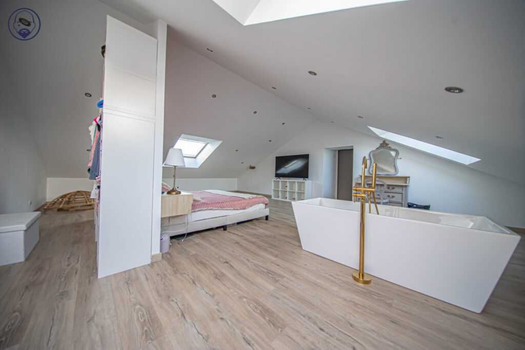 À l’étage, une grande et lumineuse suite parentale avec dressings, espace salle de bains ouvert, 2 chambres.